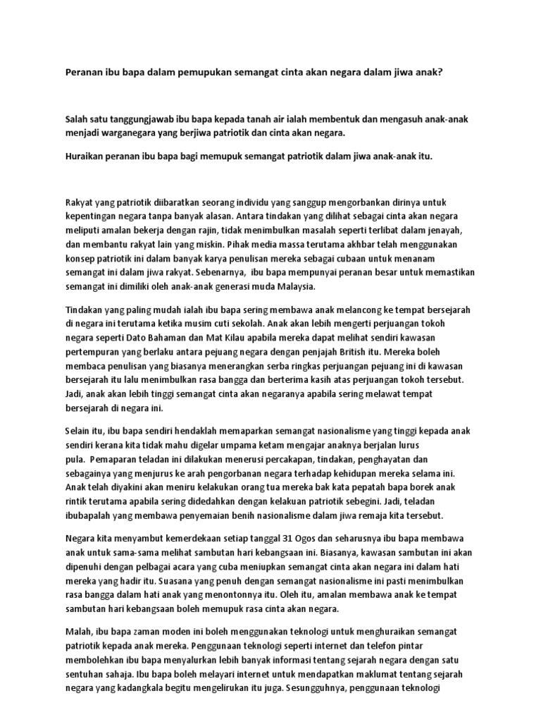 Peranan Ibu Bapa Memupuk Semangat Cinta Akan Negara Dalam Kalangan Anak Anak Karangan Bahasa Melayu Spm Pdf